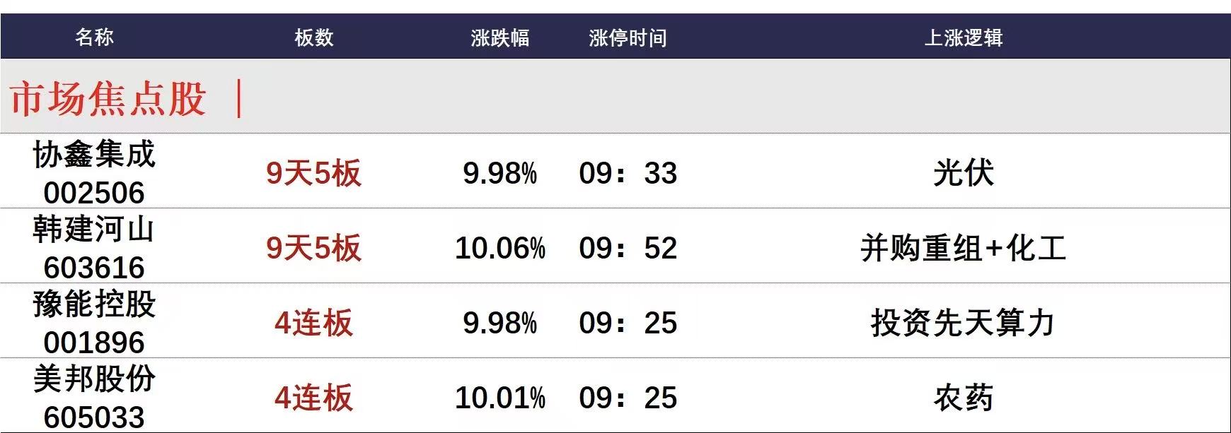 今日午盘全市场共72股涨停,连板股总数5只,29股封板未遂,封板率为71%(不含ST股、退市股)。焦点股方面,光伏板块协鑫集成9天5板,并购重组的韩建河山9天5板、豫能控股4连板,化工板块美邦股份4连板。
